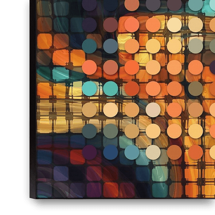 In my latest work, "Pattern of Colour," I have delved deep into the world of abstract expression. This piece is a vibrant play of colours and shapes, in which each dot and square tells its own story. It is a composition that invites the viewer to explore the complexity and beauty of geometric patterns.