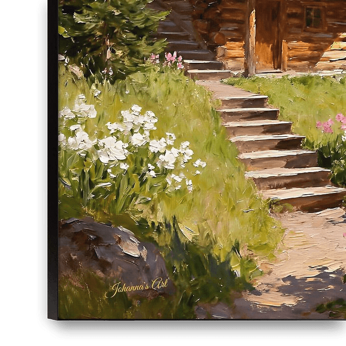 Johanna's stunning artwork invites you to step into a world of tranquility and serenity. This idyllic loghome, nestled amidst towering mountains and a gently flowing river, is a breathtaking scene that will bring peace and joy to your home.