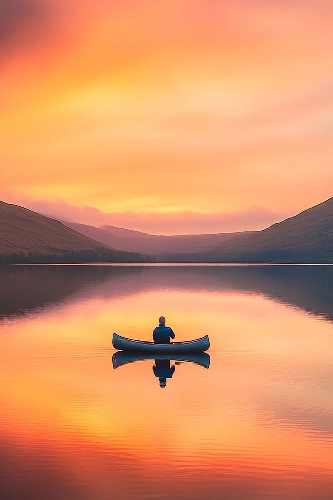 A mystical sunrise bathes the landscape in soft pastel colours, while a lone canoe floats on the smooth water. The reflective surface captures the vibrant colours of nature and exudes calm and serenity. Ideal for a living room, this work of art creates a peaceful atmosphere and invites you to daydream.