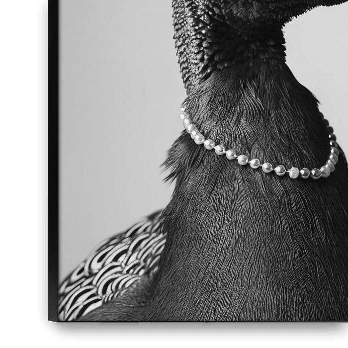 Monochrome shot of a peacock in a stylish hat with feather and round glasses. Perfect for art and animals.