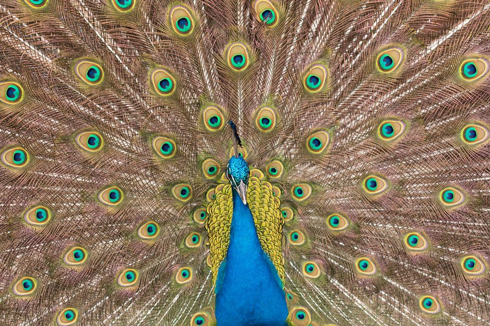 Male blue peacock. The colour print allows you to see even more clearly the beautiful colours and textures of the prong feathers (drag) that the male puts out during courtship. The front body is bright blue in colour.