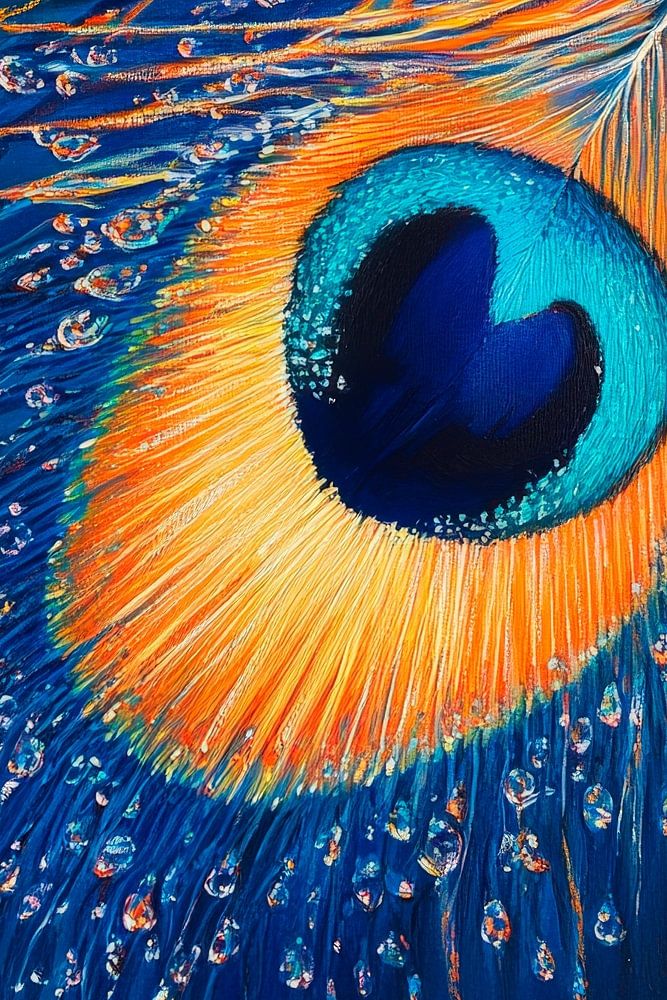 A fascinating feather unfolds in bright blue and orange tones, its majestic eye hypnotising the viewer. The intricate details and shimmering lustre give this work of art an elegant aura, perfect for a stylish living room where it will stimulate conversation and attract admiring glances.