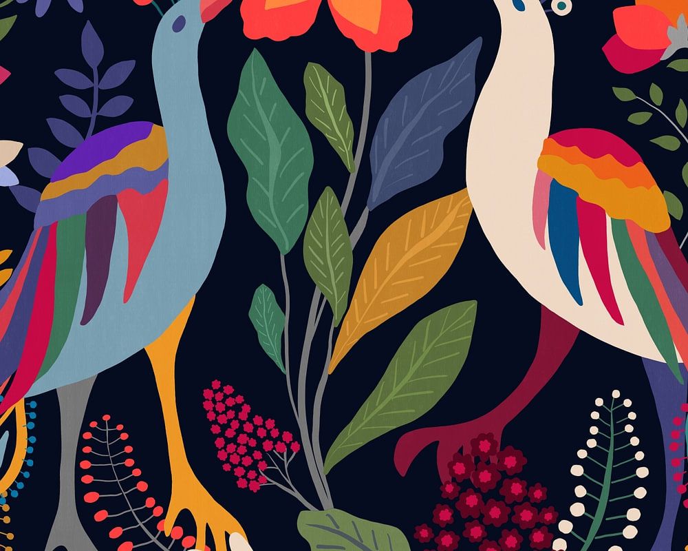 The artwork is a vibrant celebration of Mexican Otomi art. Drawing inspiration from traditional Otomi motifs, the piece features bold geometric shapes, stylized flora, and fauna reminiscent of the Otomi embroidery and painting traditions. The riot of colors—bright reds, yellows, blues, and greens—creates a striking contrast against the dark backdrop, evoking a sense of energy and vitality.