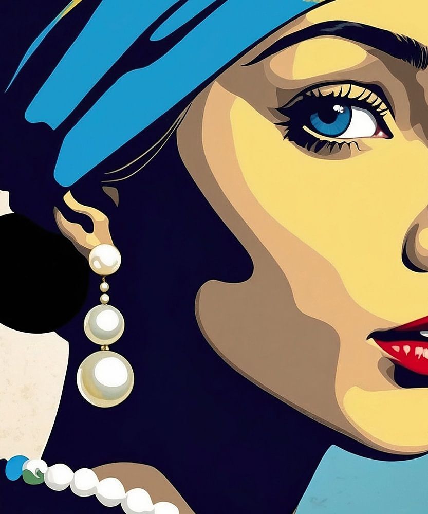 This interpretation of "Girl with a Pearl Earring," pushes the boundaries of nostalgia and modernity, in a form that retains the essence of the original but adds new dimensions. The girl, rendered in vibrant and contrasting colours, exudes a mystical elegance, and her expressive eyes immediately capture the viewer's attention. Elements of pop art combined with a touch of surrealism.