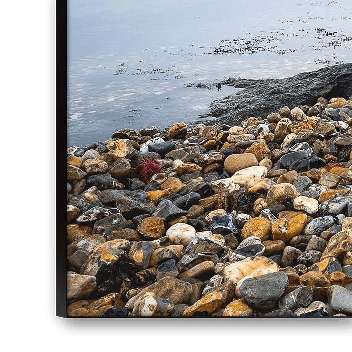 The picture shows a pebble beach on an overcast day. In the background, the calm sea meets a grey sky. Three weathered wooden poles stand in the water, their reflection visible on the surface. The foreground is filled with various pebbles in shades of brown, grey and white. The overall atmosphere is serene and slightly melancholic.