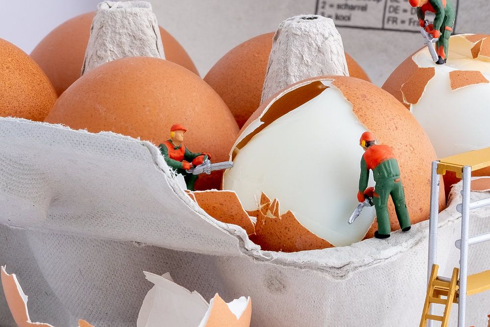 The eggs need to be peeled. The miniature men have built a scaffold so they can reach it easily. Various machines are used to remove the eggshell. What a crowd. Could it be Easter?
