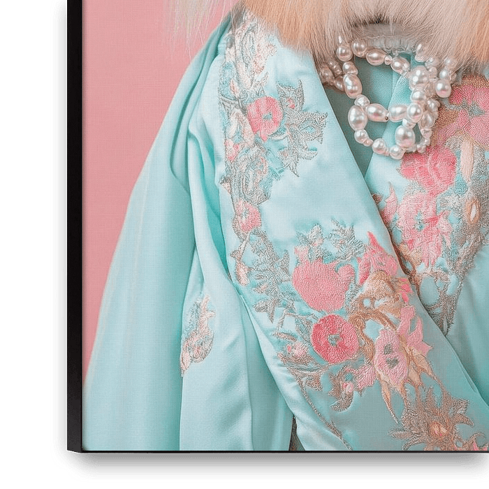 With a majestic expression and silky, long coat, this Pekingese radiates unmistakable elegance. The large bow on his head and the ornately decorated robe give him a touch of royal flair. In this charming pose, he embodies the epitome of style and grace.