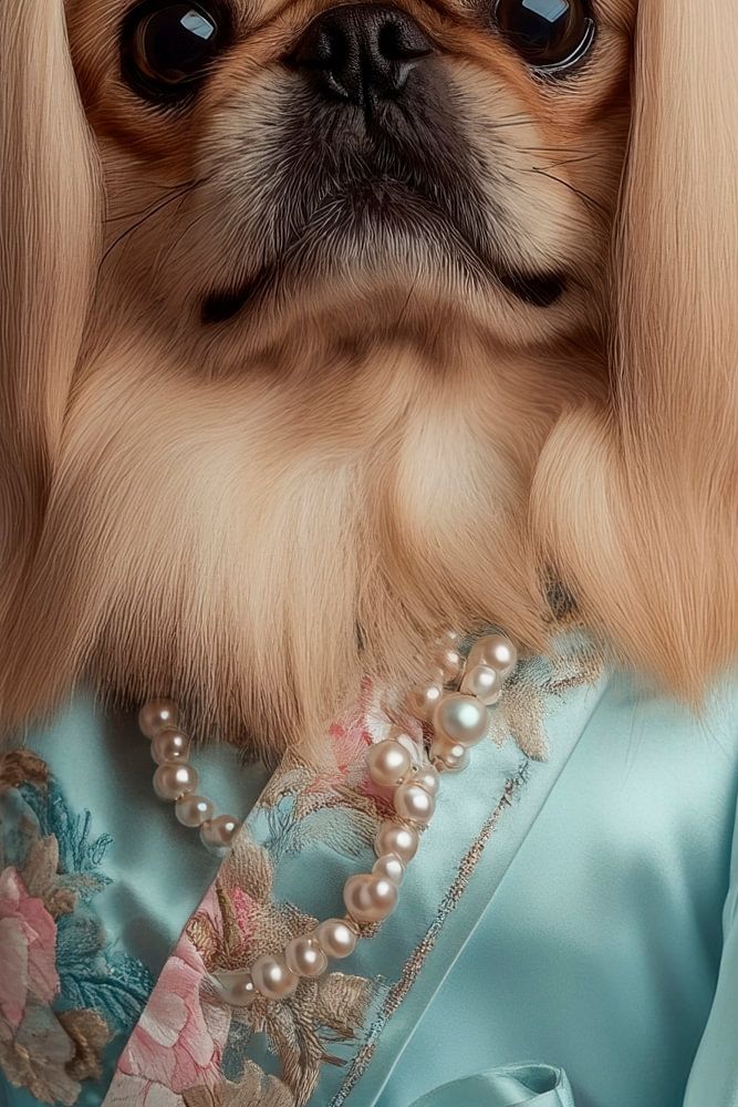This Pekingese sits enthroned in velvety elegance, his silky, golden-blonde coat framing a majestic face. With large, expressive eyes and a charming, slightly mischievous look, it embodies royal grace. Wearing an ornately decorated kimono, he proudly displays his penchant for style and glamour - a true fashion icon of the pet world!