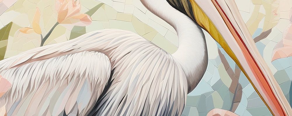 Pelican among Flowers - This stylish painting shows a pelican amidst blooming water lilies, executed in a subtle mosaic-like pattern. The harmonious colour combination of soft pinks, beiges and various shades of blue creates a serene yet vibrant composition that looks both soothing and energetic.