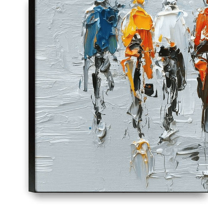 This painting shows an elongated peloton moving through a bright, almost airless landscape. The background consists of light, almost white textures, bringing out the colours of the riders - blue, orange, white and ochre yellow - powerfully. The thick layers of paint and expressive brushstrokes create a sense of spontaneous movement, as…