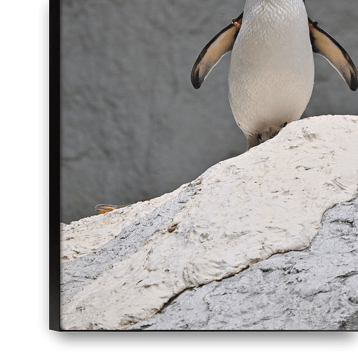 A penguin stands proudly on light-coloured rocks, with open wings and a calm gaze. Clean lines and soft contrasts make this a timeless wildlife print for modern interiors.