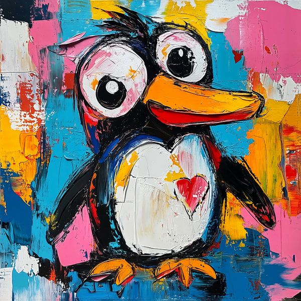 A cheerful portrait of a penguin with big eyes and a striking heart on its belly. The expressive paint strokes and bright colours give this work a playful and loving character. A real eye-catcher that adds warmth, humour and cheerfulness to any room.