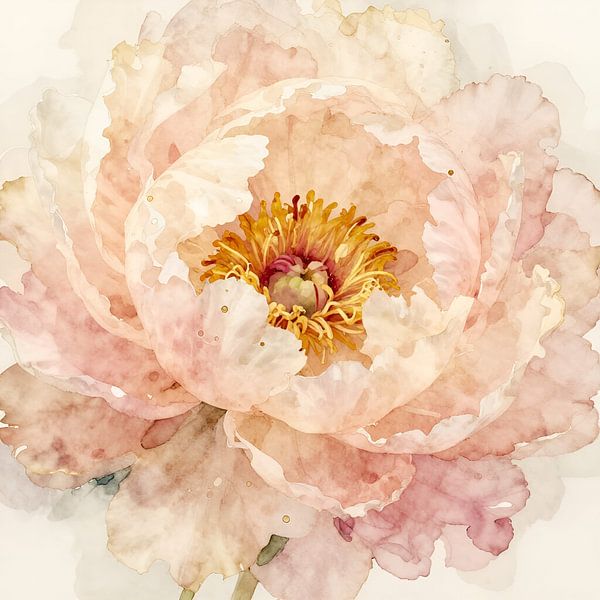 A fully opened peony in delicate watercolour – its petals unfurl in lush layers of pink, peach, mauve and warm beige, whilst the bright golden stamen at the centre serves as a radiant focal point. The transparency typical of watercolour comes into its own here: the colours flow into one another, overlap and create a depth reminiscent of…
