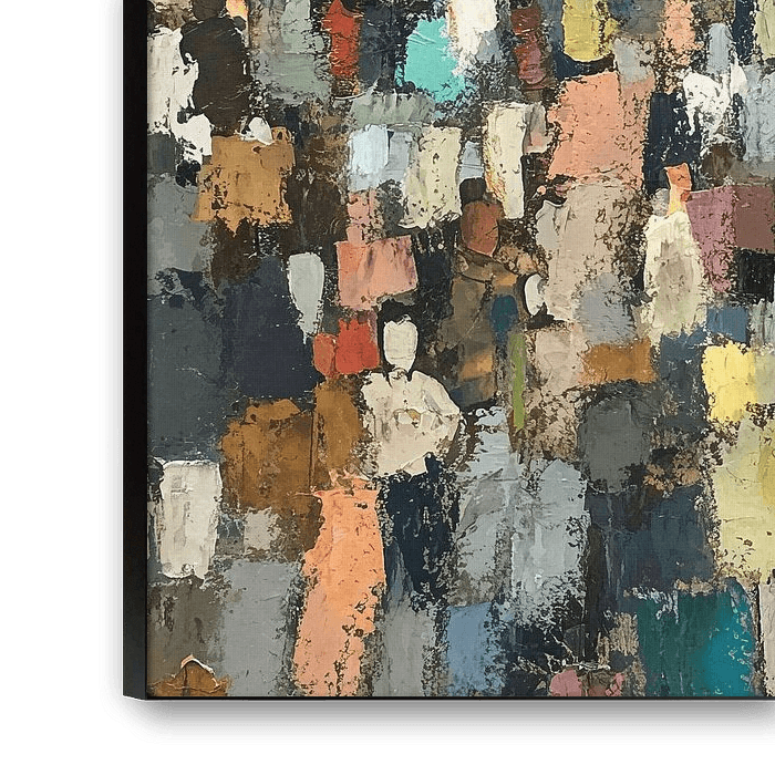 People abstract - This abstract painting shows a large group of people in different colours, with recognisable figures intermingled in vague shapes, giving a lively and dynamic look.