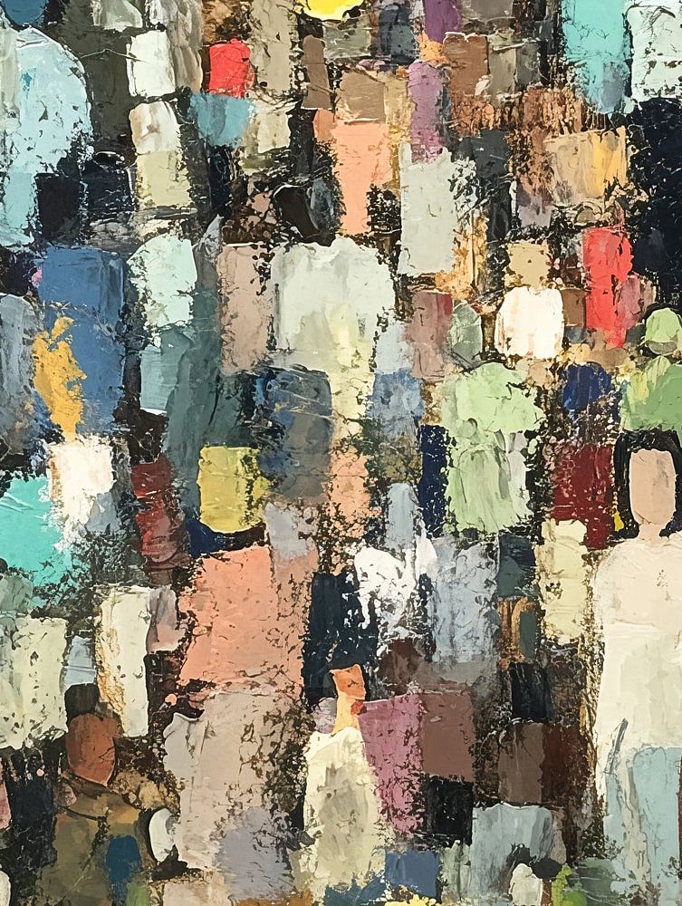 Details: abstract, people, group, colours, figures, blurred shapes, painting, art, vibrant, dynamic