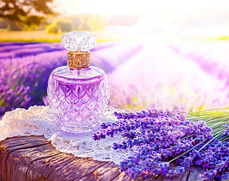 A beautiful lavender perfume bottle placed in front of a sunlit lavender field. Soft colors, light and fragrance combine into a romantic visual for scent-themed projects.