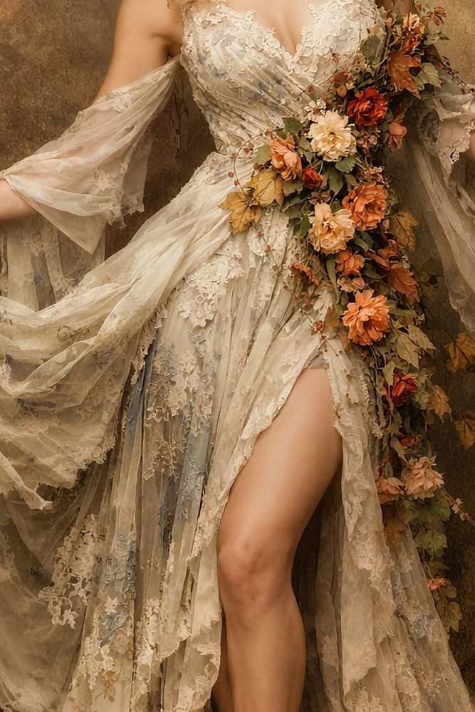 A romantic portrait of a woman in an autumnal setting, featuring flowers and lace.
