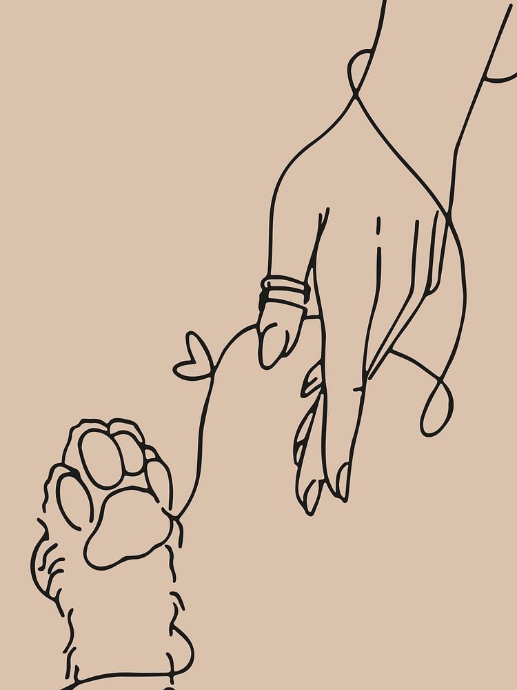 One-line illustration of a woman's hand and animal on a beige background.