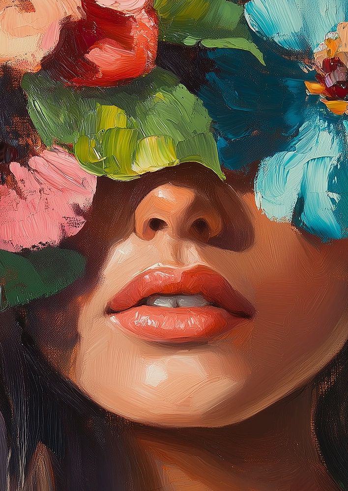 An oil painting of flowers, executed in the Impressionist style with visible brushstrokes that capture the dynamism and vibrancy of the subject. In the painting, we see a beautiful woman whose hair and parts of her face are covered with colourful petals and green leaves. These floral elements create a harmonious connection between the woman and nature, making her seem almost one with her surroundings. The vibrant colours and playful composition evoke a sense of joy and energy, and the use of impressionist techniques adds a dreamy quality to the whole, celebrating the beauty and fragility of nature in a unique way.
