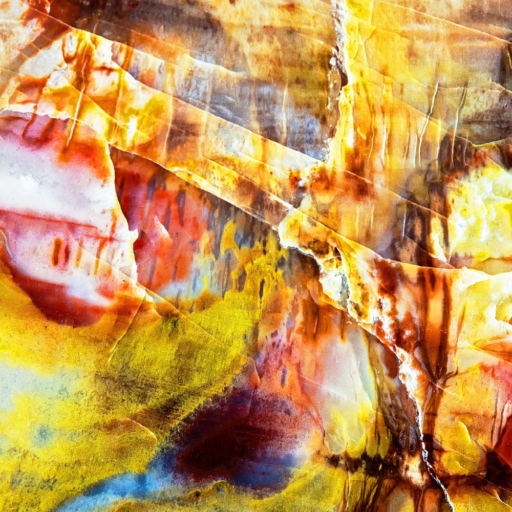 Petrified Forest National Park is an area in the northeastern state of Arizona, America. It is known for its many petrified trees, especially of the species Araucarioxylon arizonicum, which are scattered throughout the park and are strikingly colored. The area is a desert landscape. This was different during the Late Triassic, about 225 million years ago. Huge forests of giant sequoias covered low-lying swamps. A huge volcanic eruption destroyed this area. Tree trunks were buried under a thick layer of volcanic ash and mud. Over the years, water containing minerals, which are common in volcanic ash, penetrated the trunks. This caused the wood to turn into quartz. Each mineral has a different colour characteristic. Depending on the presence of a mineral species, a different colour variation can be seen in the petrified wood. When the soil began to rise, the petrified tree trunks came back to the surface in a few places, partly due to wind and water erosion. The theft of petrified wood is subject to high fines. Even moving is punishable. Fortunately, after permission of the museum, I was able to photograph some polished plates of these trees.