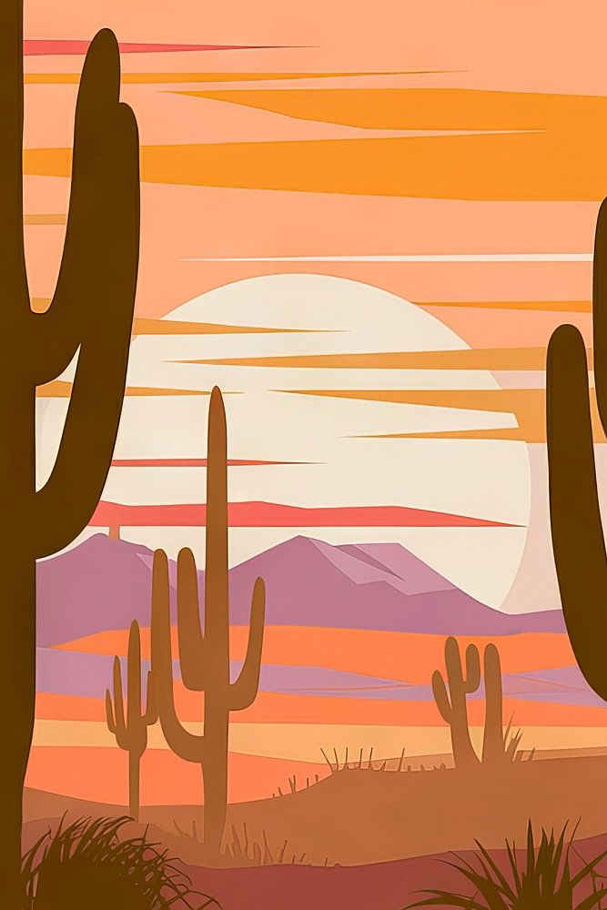 In soft orange and pink tones, an impressive desert landscape with majestic cacti shines against a glowing sunset. The harmonious composition embodies the tranquillity of the Sonoran desert and brings a touch of nature into every home. Ideal for the living room, it creates an inviting atmosphere and awakens a wanderlust for adventure.