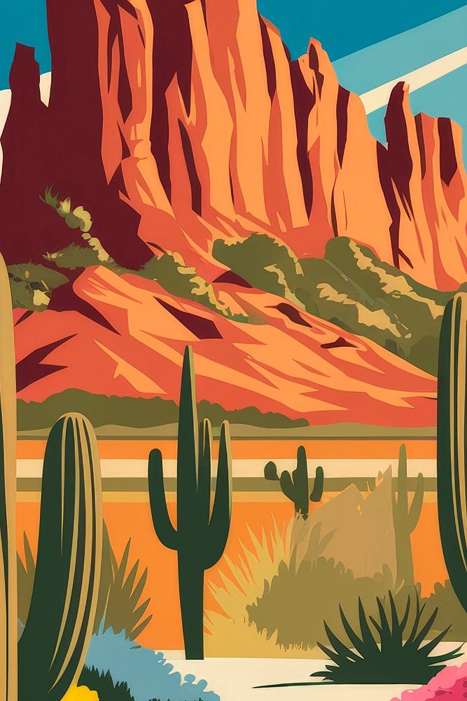 A warm oasis of colour, where the contours of majestic mountain formations and the vibrant nuances of the desert merge harmoniously. Green cacti and colourful flowers exude joie de vivre, while a radiant sky evokes memories of sunny days. Perfect for the living room to enrich your room with a touch of adventure and nature.