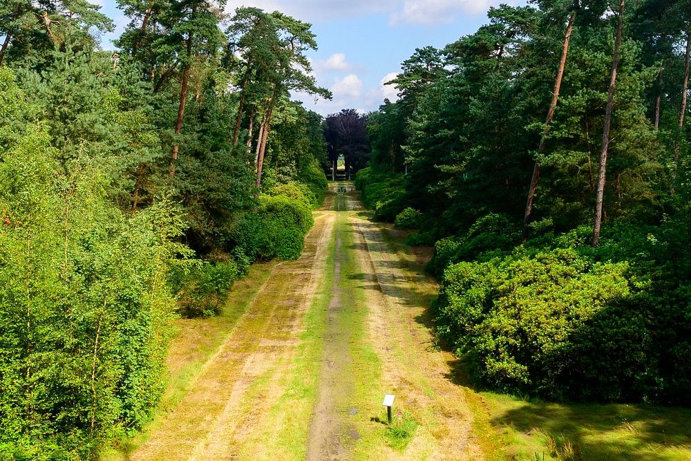 A breathtaking photograph captured from a unique angle on a hill, offers a stunning view of a wide road winding its way through a dense forest. The clear blue sky with soft white clouds provides the perfect backdrop for this serene natural setting. The photo, with impressive was taken near the Ravenhof in Stabroek, Belgium, close to the Dutch border. This beautiful forest is part of the De Zoom nature reserve, which stretches across both Belgium and the Netherlands.