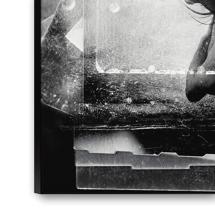 Surrealist conceptual art in primarily black and white and shades of gray on weathered paper texture. Mixed media with a collage of old photographs and photo negatives.