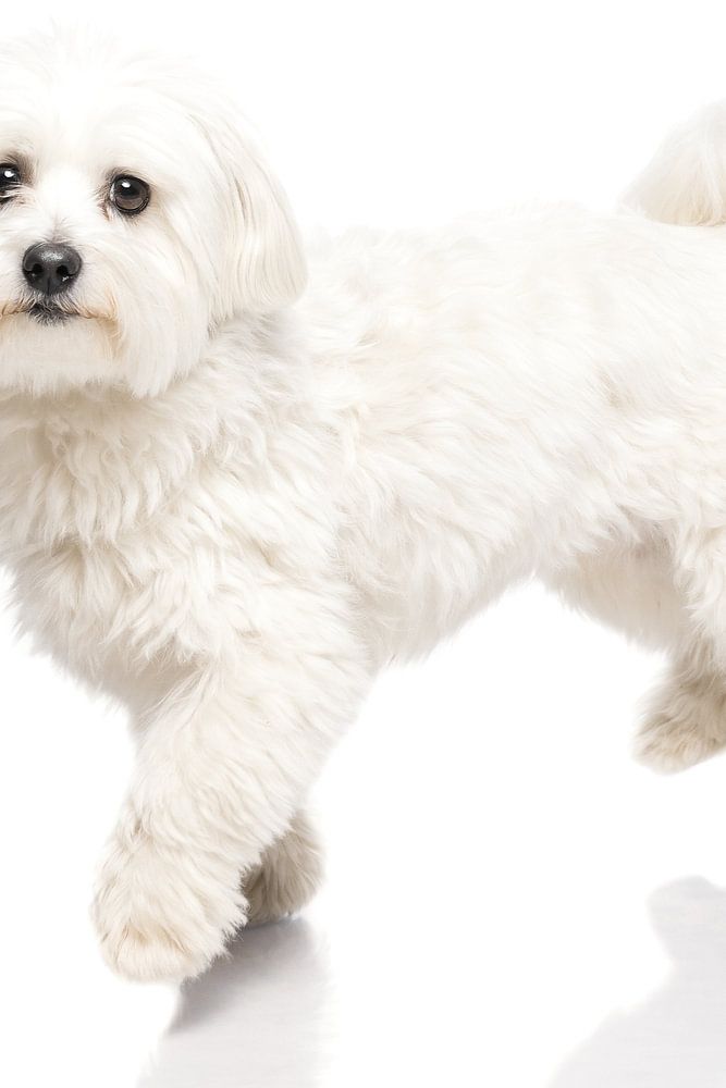 Studio photo of a Maltese dog with white background. The dog is on a flexi plate, so you can see its mirror image. The dog is also looking straight into the lens.