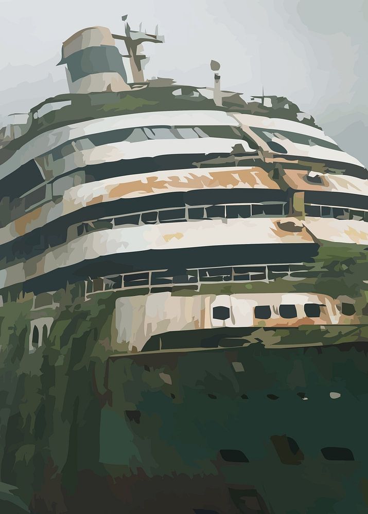 Photorealistic drone photo of a mountain slope covered in dense vegetation with a mist of humidity. Among the greenery, the outlines of a massive, aged, and rusty cruise liner are visible. The scene is epic and mysterious, reminiscent of the X-Files, with the overgrown jungle partially obscuring the ship. The atmosphere is eerie and captivating, with the mist adding a sense of intrigue and otherworldliness. The lush green foliage contrasts with the decaying, rusted structure of the cruise liner, creating a surreal and enigmatic visual.
