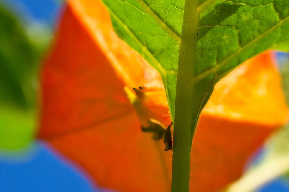 Physalis plant with green-orange fruits between the green leaves. Summer fruit