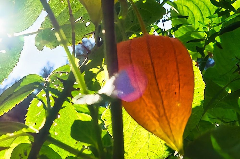 Physalis plant with green-orange fruits between the green leaves. Summer fruit