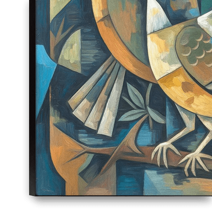 A group of stylised birds is depicted in a cubist style with geometric shapes. The background shows trees and a colourful ray of sunshine.