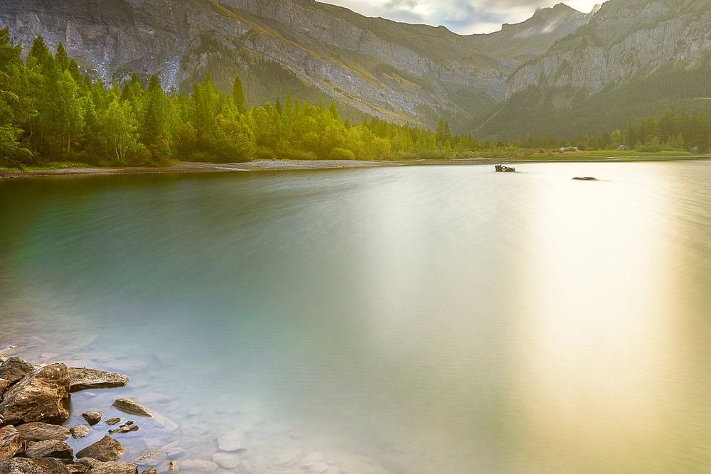 Captured this beautiful sunrise in Switzerland. Poetry in the making. Two mountains, a quiet and calm lake, the sun rising behind the mountains and lighting up the whole scene beautifully.