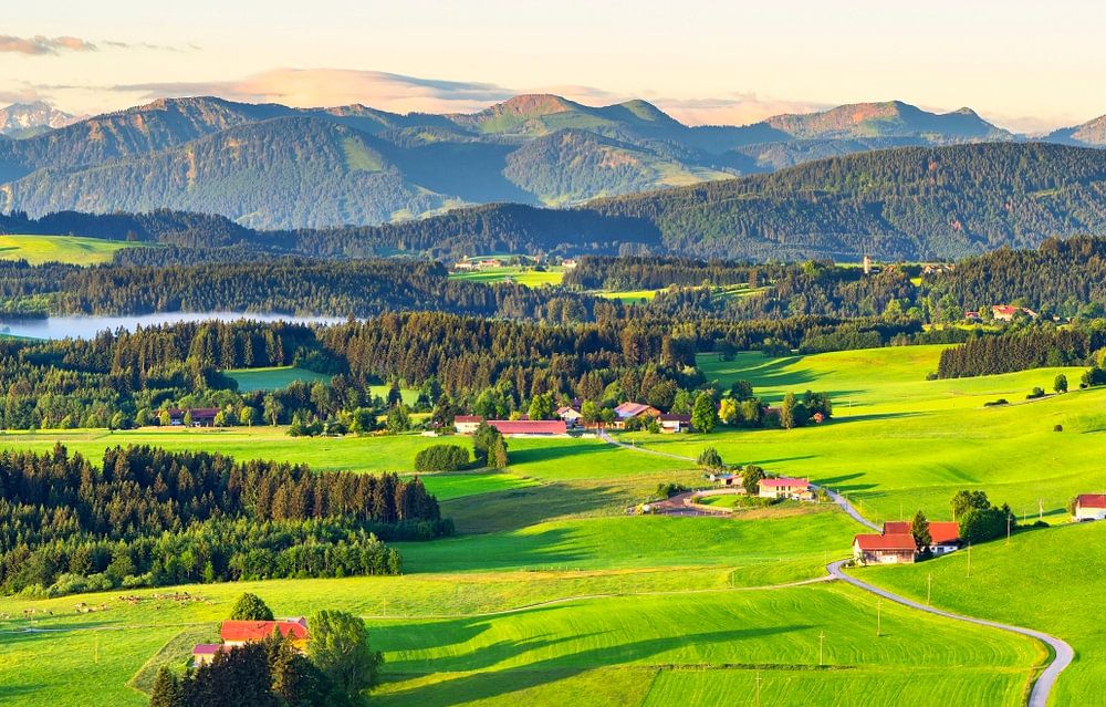 Idyllic morning atmosphere in the Allgäu with meadows and forests under a blue sky. In the background the Allgäu Alps with the Nagelfluhkette. Bavaria, Germany