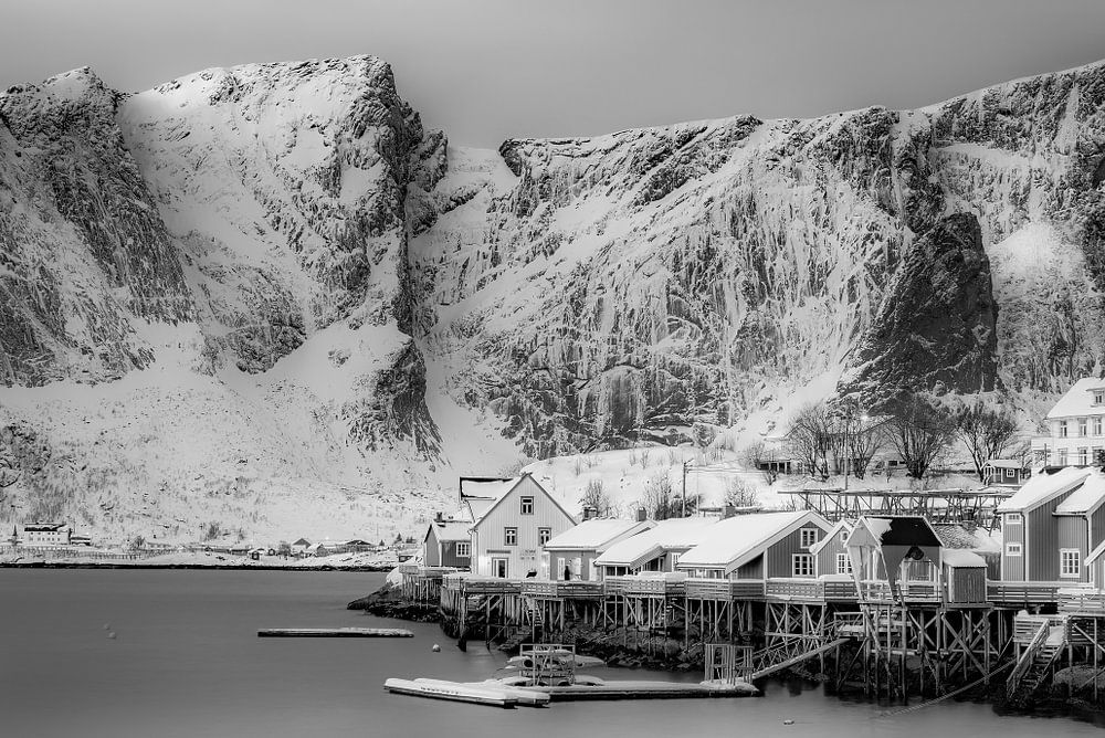 About "Picturesque fishing village by the sea in Norway in black and white."