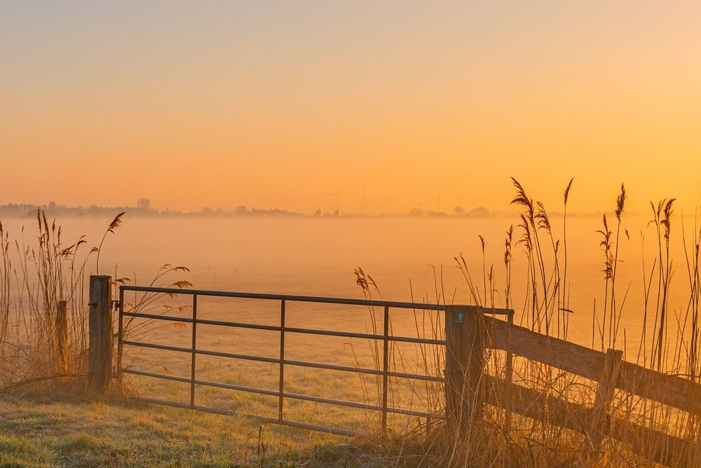 It is very early in the morning. A little frost is visible on the grass and morning mist hangs over the fields. The sun is just rising and gives a magical orange effect to the entire image. In the foreground, the silhouettes of a steel gate and reed plumes stand out against the background.
