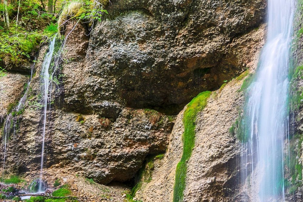 Idyllic waterfall with green forest in the Gunzesrid valley. Allgäu Alps, Bavaria, Germany, Europe