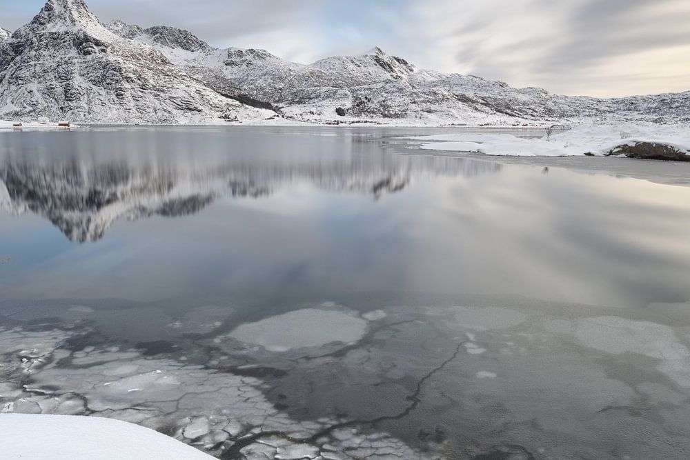 Frozen stillness and Nordic magic: this breathtaking landscape image shows the snow-covered coastal landscape of the Lofoten Islands in Norway, taken at Flakstad Pollen. The long exposure transforms the arctic light and the movement of the clouds into a surreal natural spectacle. Ice floes float on the crystal-clear water, which appears as smooth as glass thanks to the long exposure technique. The snow-covered mountains in the background are softly reflected in the water, while the sky glows in delicate pastel colours.