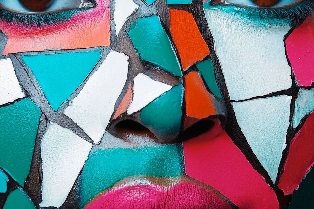 A fascinating interplay of colours and shapes transforms the face into a work of art reminiscent of broken ceramics. The vibrant shades of turquoise, pink and orange radiate an extraordinary energy and invite you to marvel. Ideal for a modern living room that celebrates creativity and individuality.