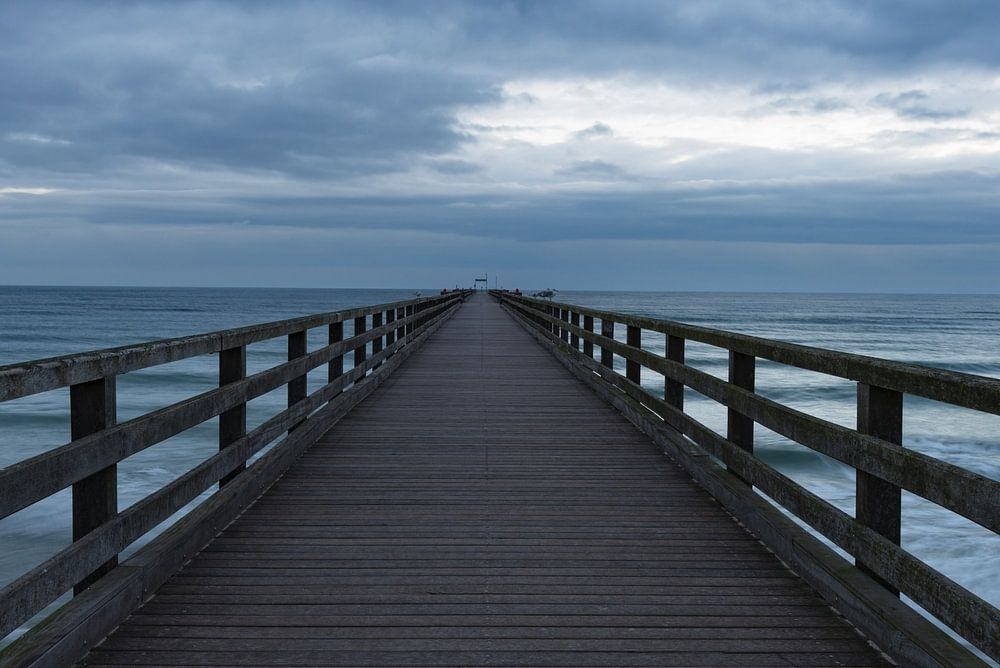 An early January morning light envelops the pier in the seaside resort of Binz in a melancholy silence. The long, unlit bridge stretches defiantly into the impetuous Baltic Sea, its silhouette silhouetted against the lead-grey sky. Clouds hang heavy and low, their sombre shapes reflected in the calm but ominous-looking water. The cold sea air, filled with a salty sharpness, bites gently into the skin and lets the breath rise in fine clouds.