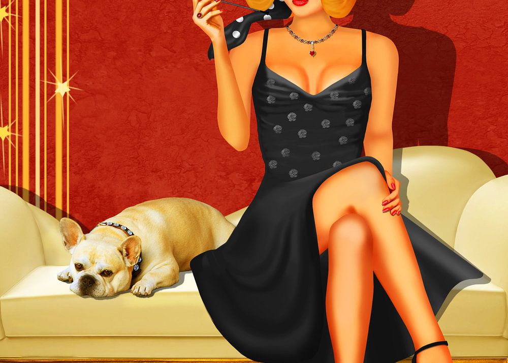 Elegant pin up girl in the retro style of the 50s, on the sofa with dog in bright colors, gold, red and brown.