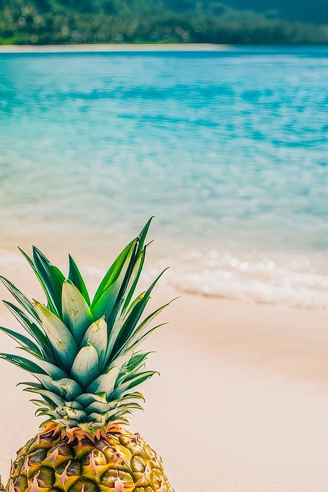 A juicy symbol of tropical joie de vivre rests gently in the warm sand, surrounded by bright blue water and majestic mountains. This vibrant pineapple exudes a holiday mood and awakens longings for sunny beaches. Perfect for the kitchen or living room, it brings a touch of exoticism and freshness to any room.