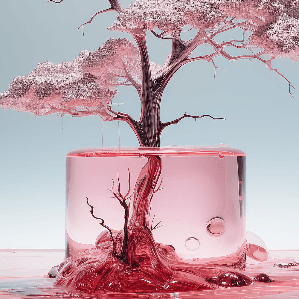 A surreal image of a pink bonsai tree in a glass with a pink liquid spilling out.