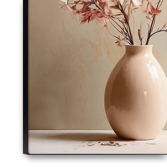 A poetic composition of delicate flowers in soft pink and white hues, elegantly displayed in a minimalist white vase. The artwork exudes tranquility and refinement, with delicate branches and blossoming buds against a warm, neutral background creating a timeless beauty that is both soothing and visually enchanting.