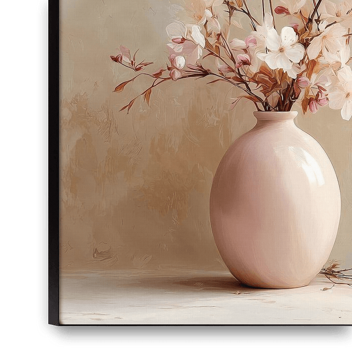 A painting that exudes serenity: delicate, pastel-hued flowers nestle in a matte pink vase against a warm, textured background. The composition balances between full blossoms and sparse branches, creating a pleasantly chaotic harmony—an ode to subtle beauty and minimalist elegance.