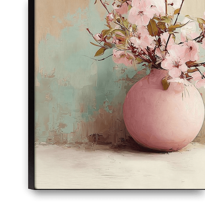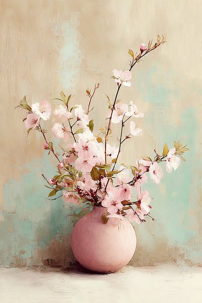 This painting captures the delicate beauty of an overflowing arrangement of blossoms in a round pink vase. With soft pastel colors and a rustic, distressed background, the artwork creates a romantic atmosphere that exudes tenderness and ephemerality. The composition perfectly balances the robust shape of the vase with the flowing…
