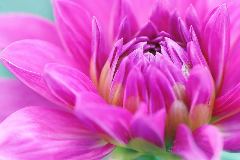 A pink dahlia against a soft green background.