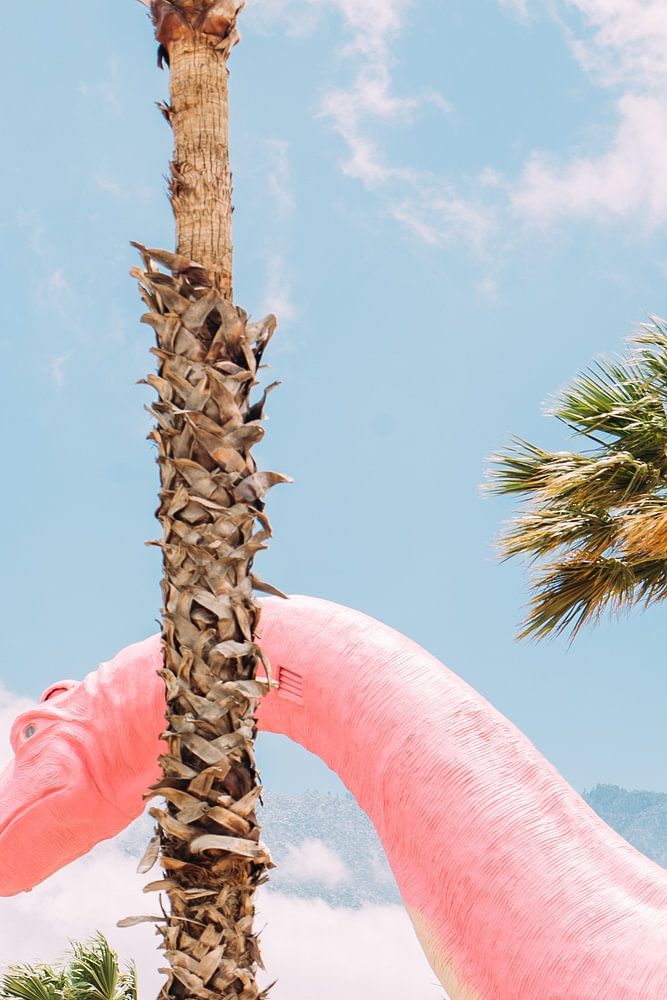 A pink long-necked dinosaur in Cabazon, USA, with palm trees surrounding the sculpture.