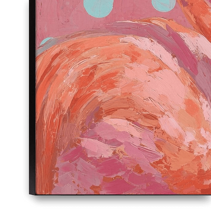 Pink Flamingos with Aqua Dots - This painting depicts two elegant flamingo's looking at each other, framed by a cheerful pink background with striking aqua dots, giving it a modern and playful look, perfect for lovers of animal paintings and colourful art.